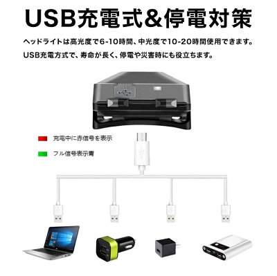 ・ 【USB充電式&停電対策】ヘッドライトは内蔵1400 mAhポリマーリチウム電池、6-10時間の高輝度で使用できます、10-20時間の中輝度で使用できます。