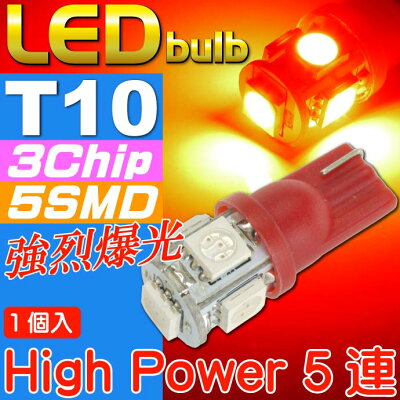 商品名 T10 LEDバルブ5連砲弾型 3Chip5SMD 商品説明 3Chip内臓5連ハイパワーSMD T10 LEDバルブです。