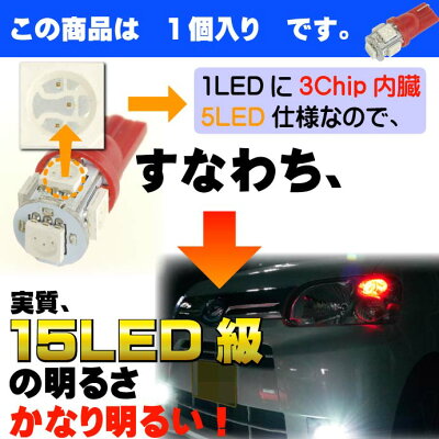 1LED(SMD)に3Chip内蔵ですので、実質15LED仕様で、側面部は3chip SMD1個×4面、TOP部は、3chip SMD1個でかなりの明るさ! ポジション球・ルーム球・ドアランプ・ナンバー灯などに最適です。