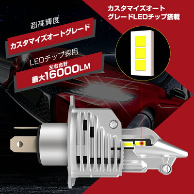 【製品仕様】 商品名:高輝度LED ヘッドライト 搭載LEDチップ:カスタマイズオートグレードLEDチップ ルーメン:16000LM(左右合計) 色温度:6500K 防水等級:IP67 本体材質:アルミニウム 寿命:約50000時間 電圧:DC 12V専用 商品内容:LED バルブ×2 選択形式:H4 【商品詳細】 最新登場、業界初モデル!車・バイク両用!車検対応・純正配光・瞬間起動・高輝度・省電力・長寿命! ◆カスタマイズオートグレードLEDチップを搭載:カスタマイズオートグレードLEDチップ採用により、最大16000lmで、夜でも心配しなくて安全に運転できる! ◆純正配光:純正のハロゲンとの同じ発光位置で、完璧な配光を実現!99%の車種に適応できます。